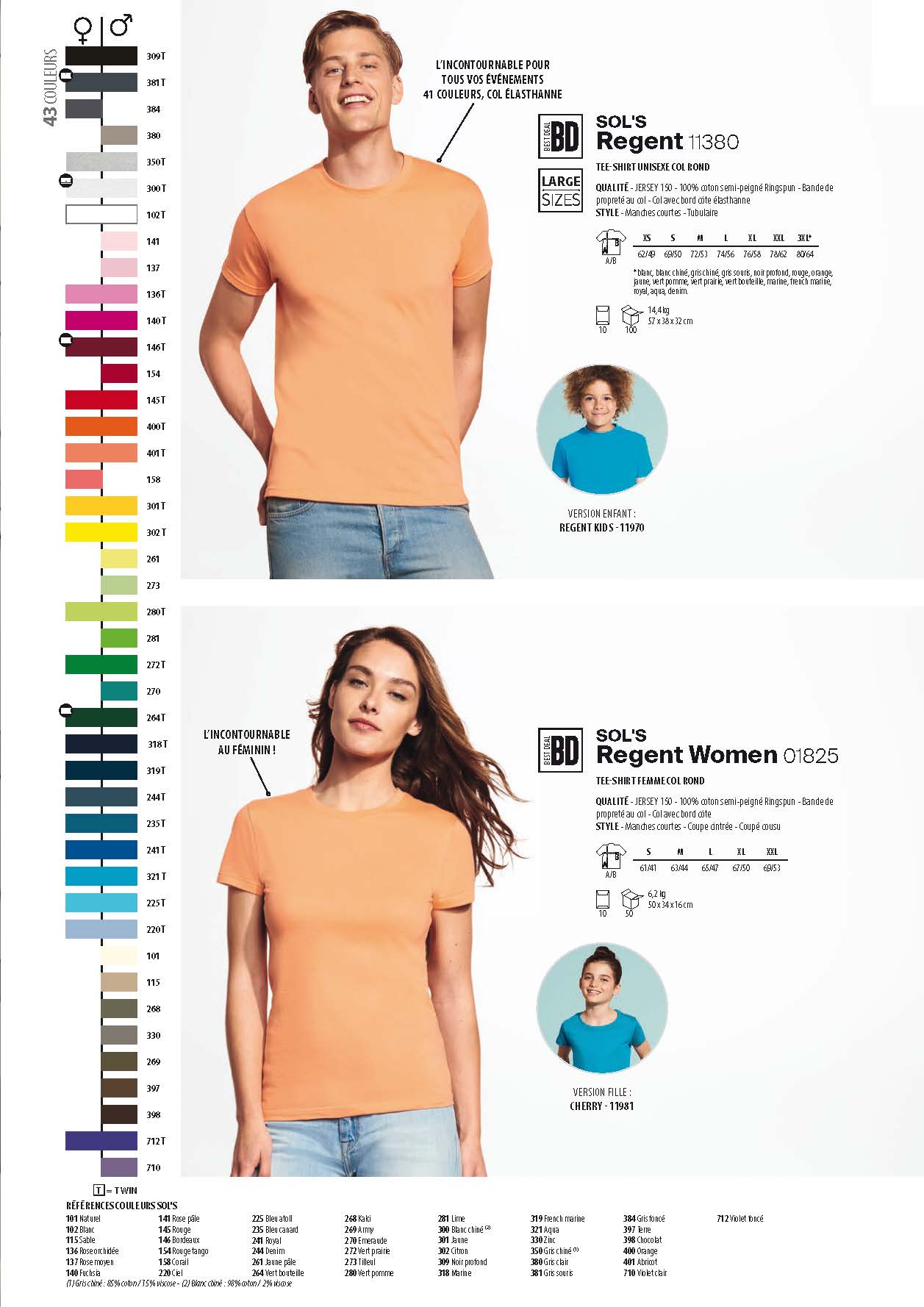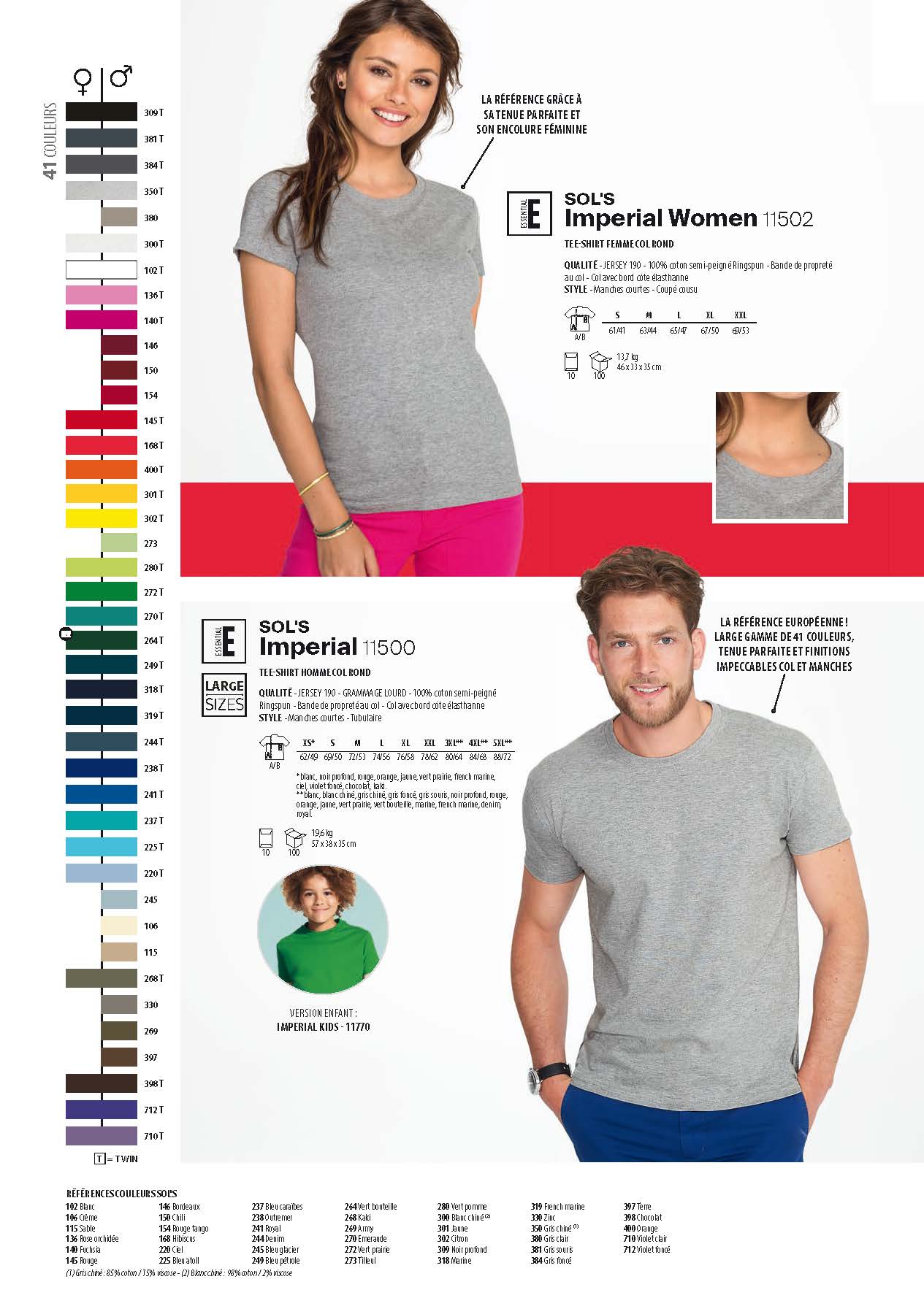 Le SOL’S Impérial est devenu la « »référence » » du t-shirt 190 gm par sa finition, sa qualité, ses 42 couleurs, ses 9 tailles, ses versions femme et enfant, son niveau de stock unique en Europe.